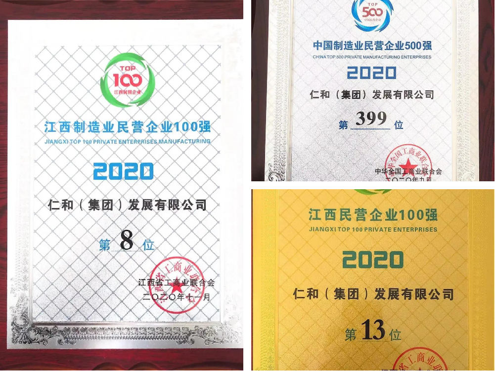 2020年11月8日,2020江西民營企業100強峰會在南昌市召開。仁和集團位列2020江西民營企業百強第13位、2020江西制造業民營企業第8位,并在現場獲頒證書。
